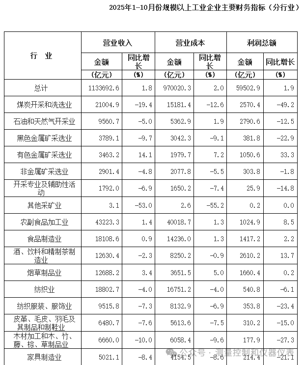11月27日,国家统计局公布了2025年1-10月份全国规模以上工业企业实现利润总额增长状况。1-10月份,全国规模以上工业企业实现利润总额59502.9亿元,同比增长1.9%。其中,1-10月份,仪器仪表制造业营业收入8675.8亿元,同比增长4.4%,实现利润总额843.6亿元,同比增长3.3%。