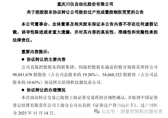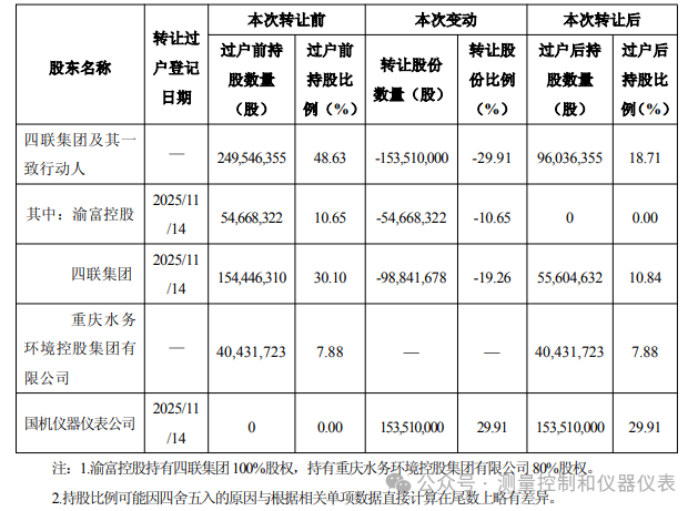 川仪股份直接控股股东四联集团、间接控股股东渝富控股与国机集团及其下属全资子公司国机仪器仪表公司于2025年签署股份转让相关协议,四联集团、渝富控股拟分别将其所持有的川仪股份98,841,678股无限售流通股(占公司总股本的19.26%)、54,668,322股无限售流通股(占公司总股本的10.65%),通过协议转让的方式转让给国机仪器仪表公司。